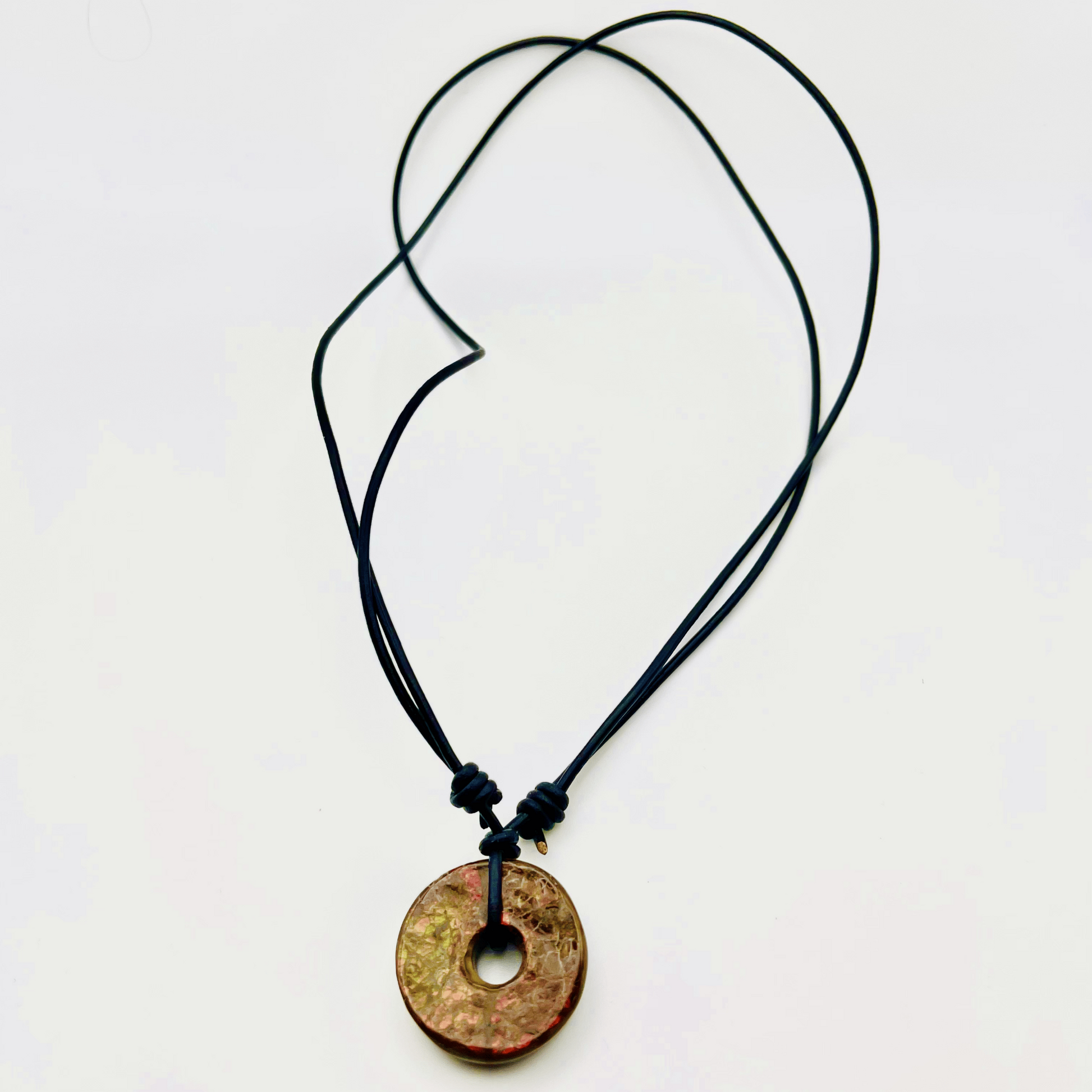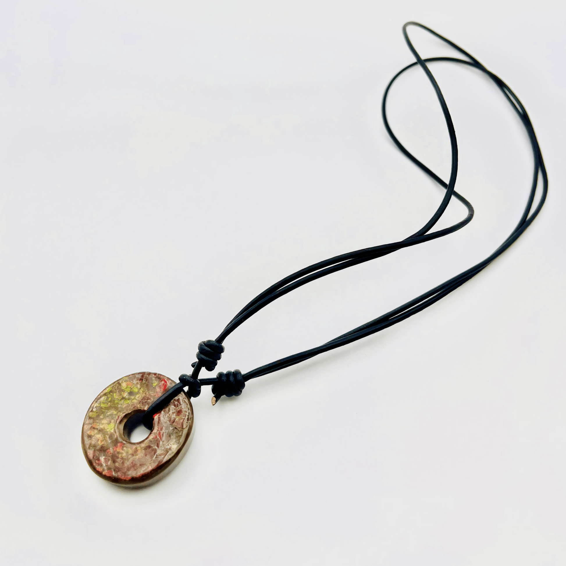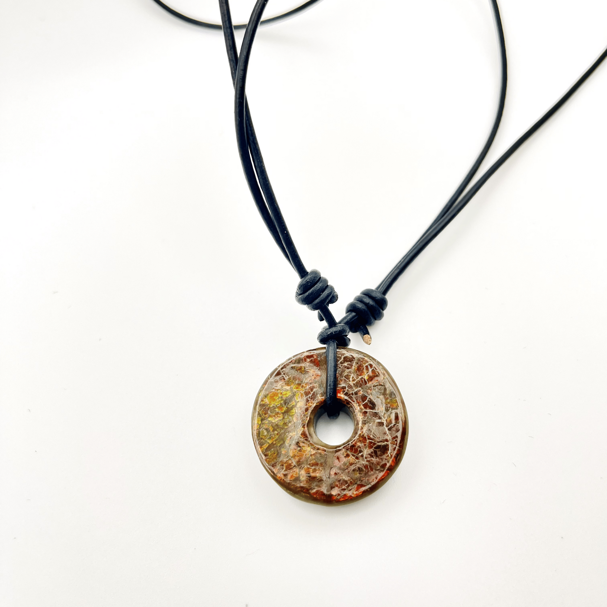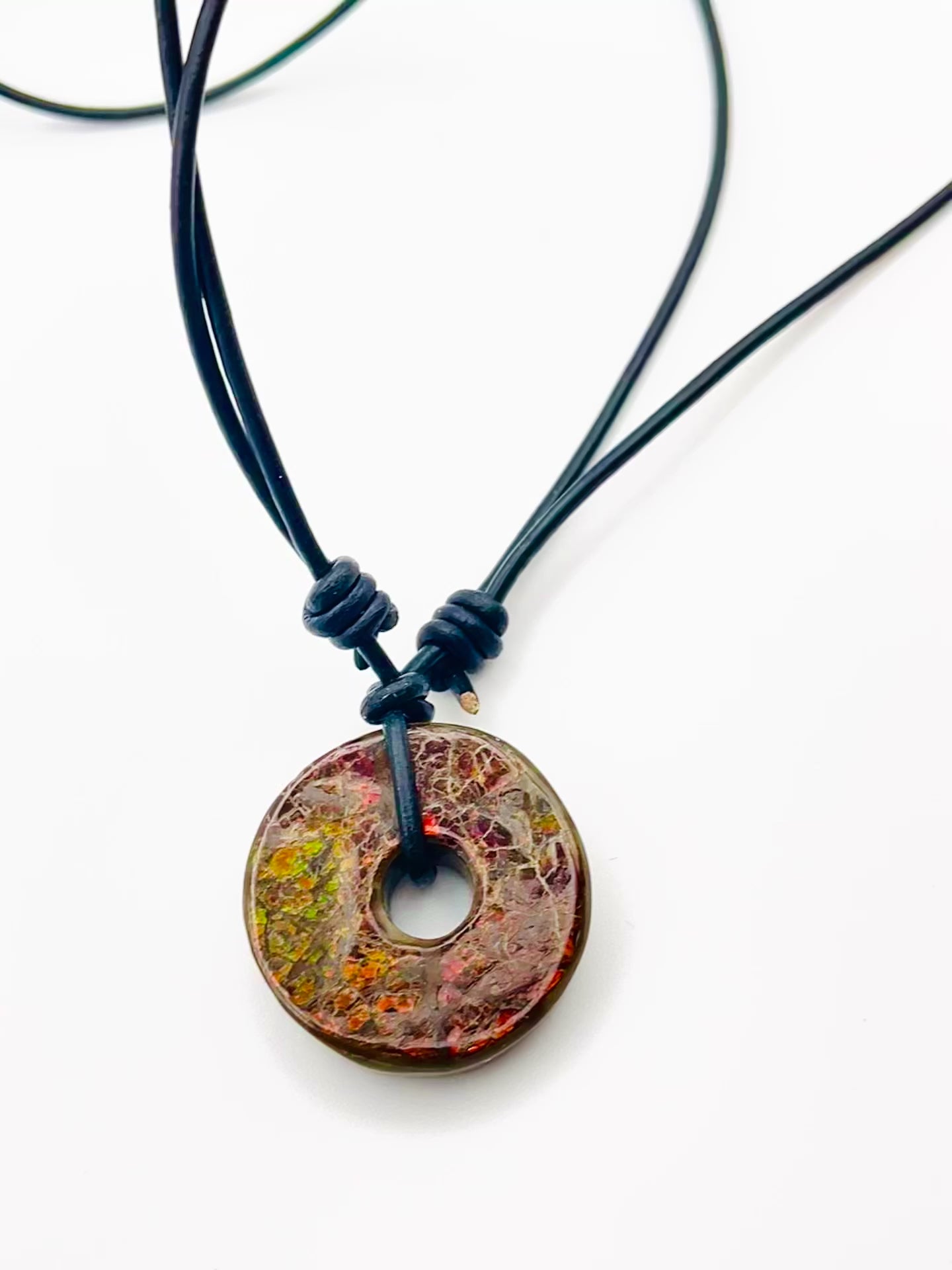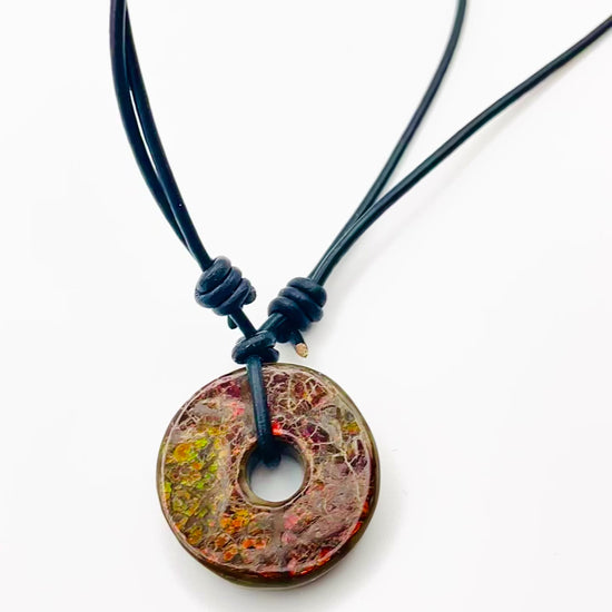 Deep Green & Red 30x30mm Donut Ammolite "Canada’s Opal" Gemstone with Sliding Black Leather Cord Necklace
