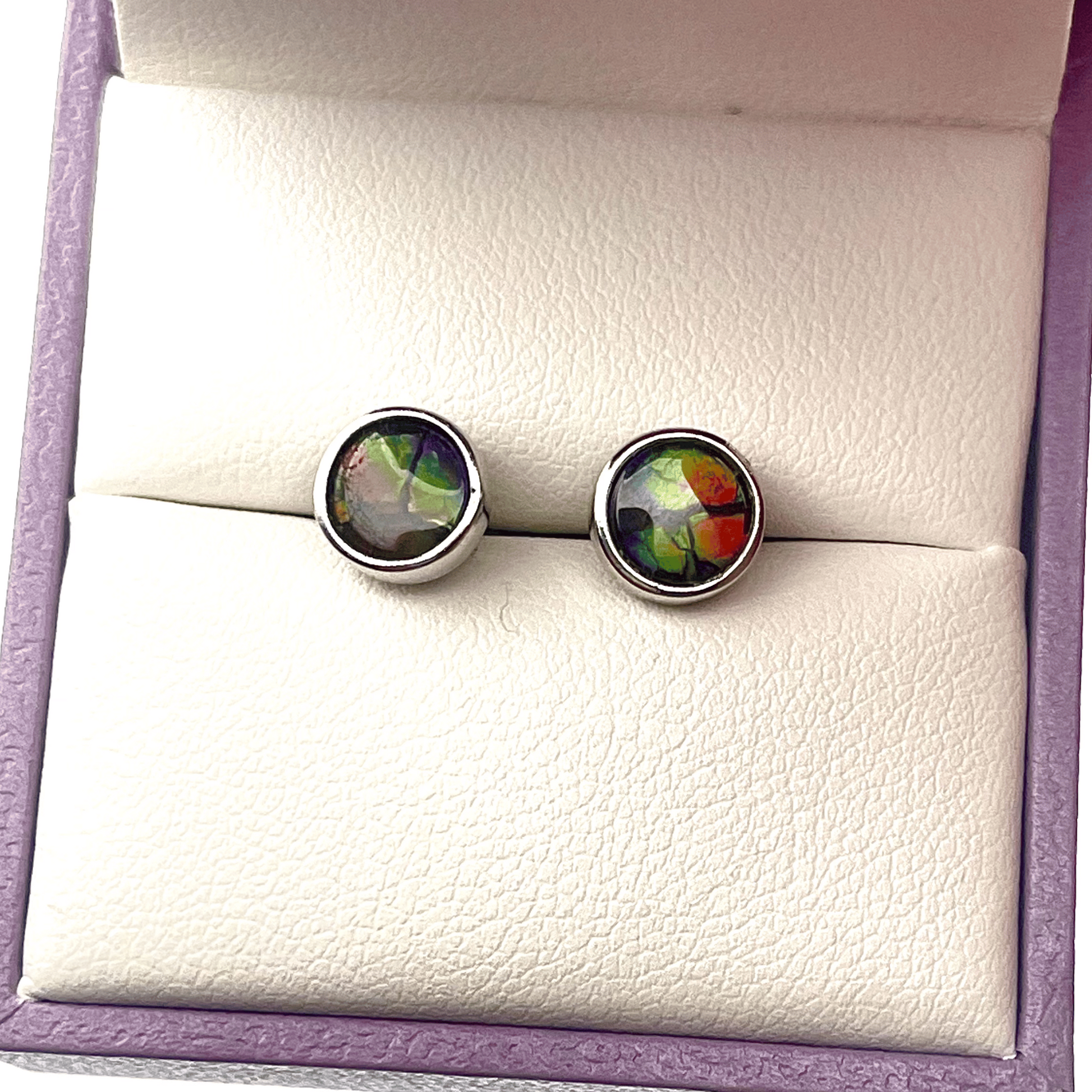 Stunning Dragon Skin Ammolite Stud Earrings – 6x6mm Red, Green & Blue – Sterling Silver