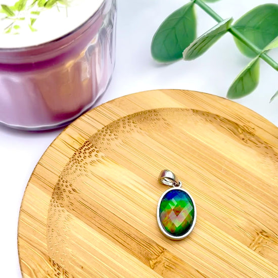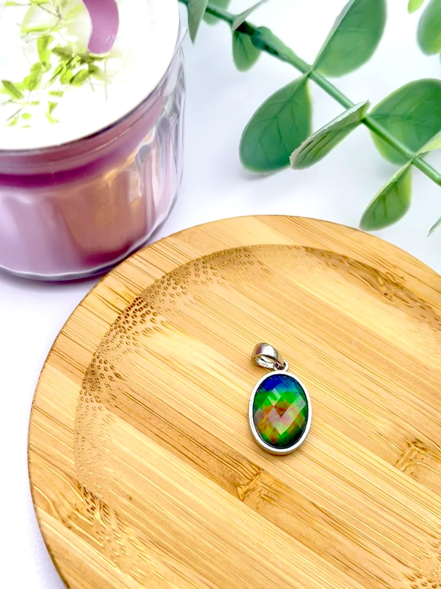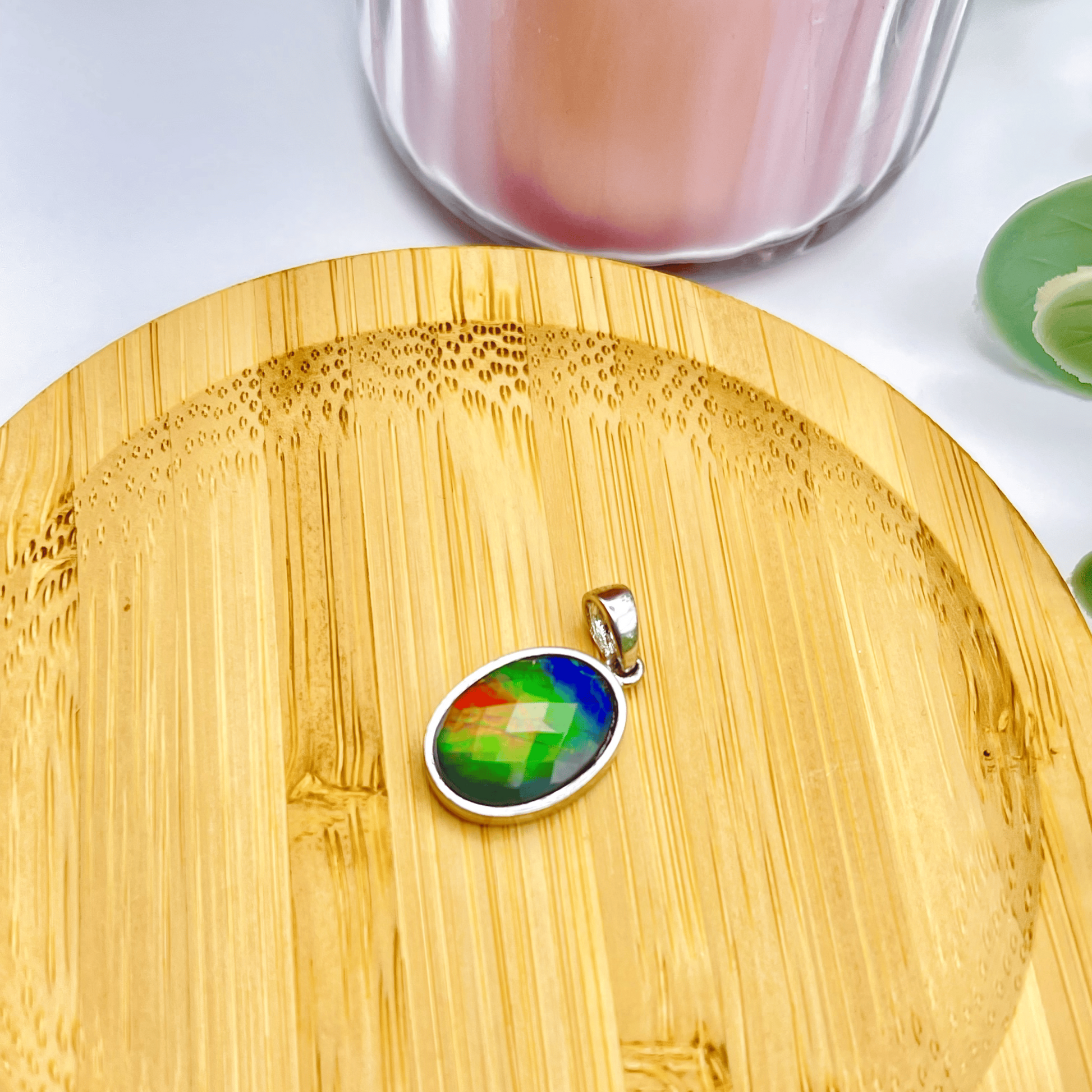 Faceted Oval AA Grade Ammolite Sterling Silver Pendant – Blue, Green & Hints of Red-Orange 10x14mm Triplet Gem