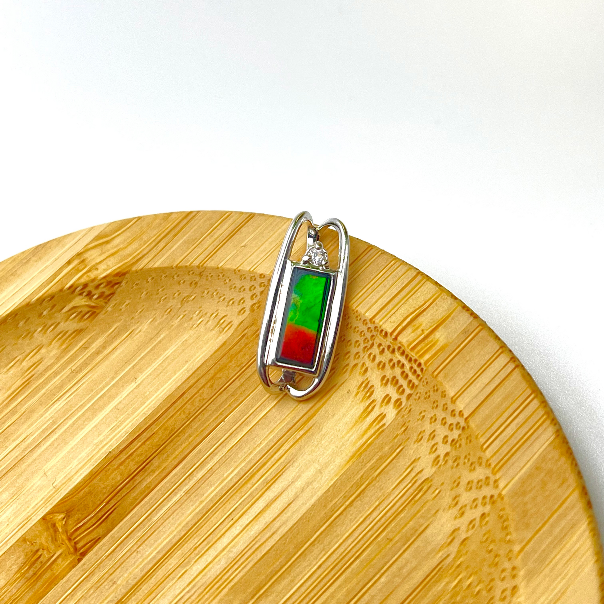 Elevate your jewelry collection with this exquisite Canadian Ammolite pendant, featuring a vibrant 4x10mm rectangular Ammolite gemstone that shimmers with mesmerizing green and red hues. Encased in 925 sterling silver, this elegant pendant is accented by a brilliant white sapphire, adding a touch of sophistication and sparkle. Whether worn as an everyday statement or for a special occasion, this pendant is a timeless symbol of beauty, prosperity, and transformation.