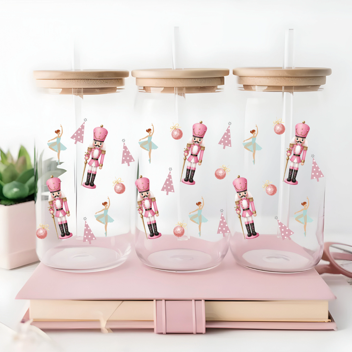 Elevate your holiday celebrations with this enchanting Nutcracker Glass Cup! Adorned with whimsical nutcracker, ballerina, and Christmas ball ornaments, all set against a delightful pink color theme, this cup is a festive masterpiece. Perfect for serving all your favorite holiday beverages, it adds a touch of magic to every sip.