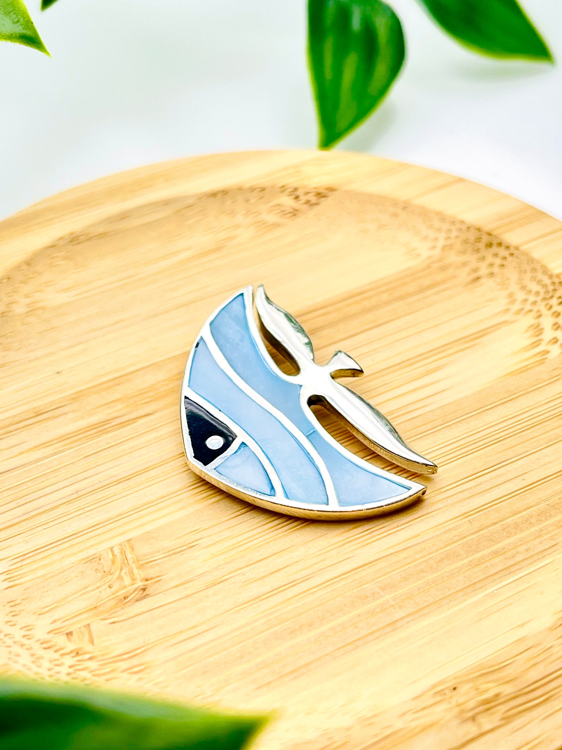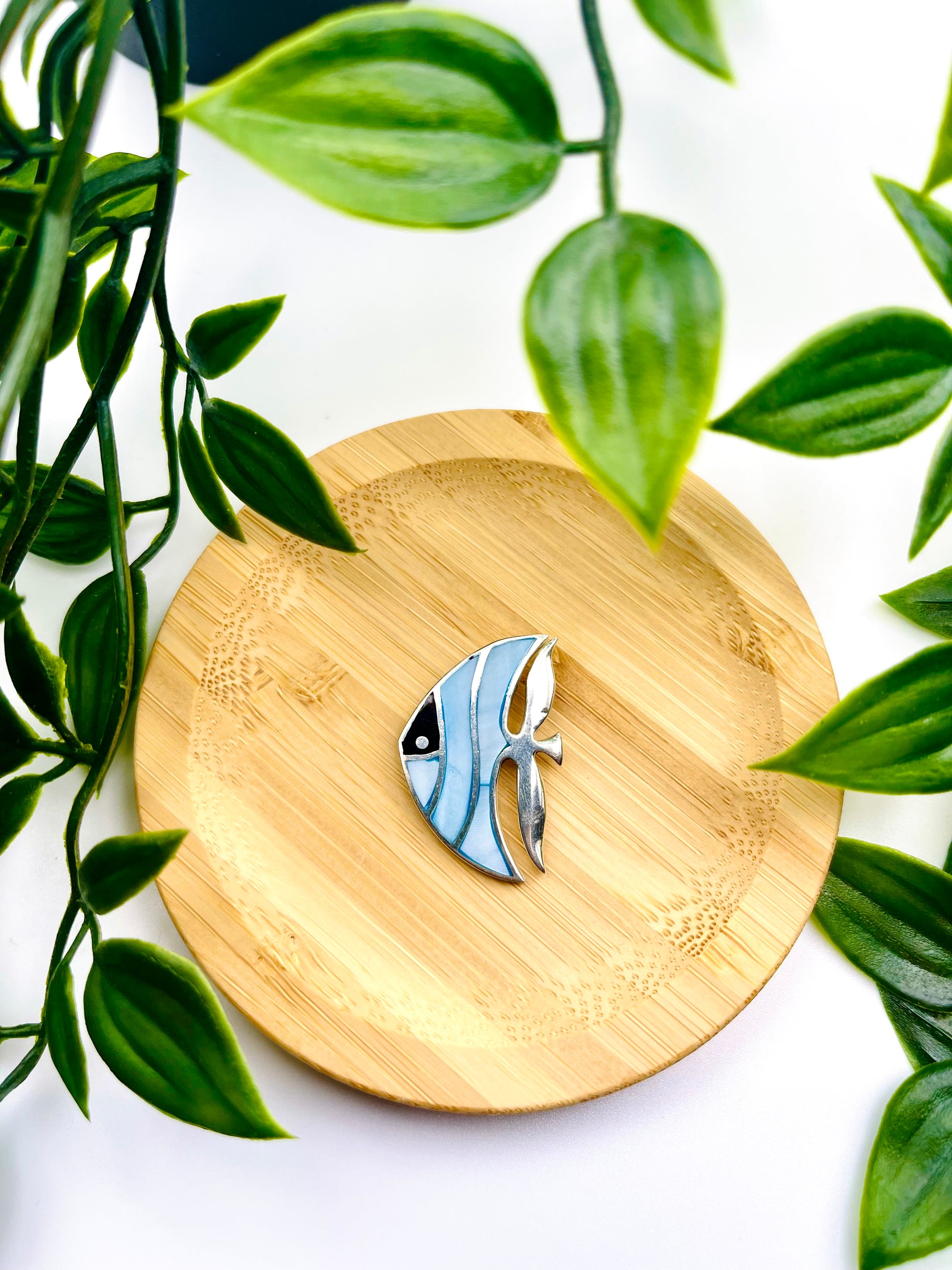 Sterling Silver Black Onyx & Blue Mother of Pearl Inlay Angel Fish Pin Brooch Pendant