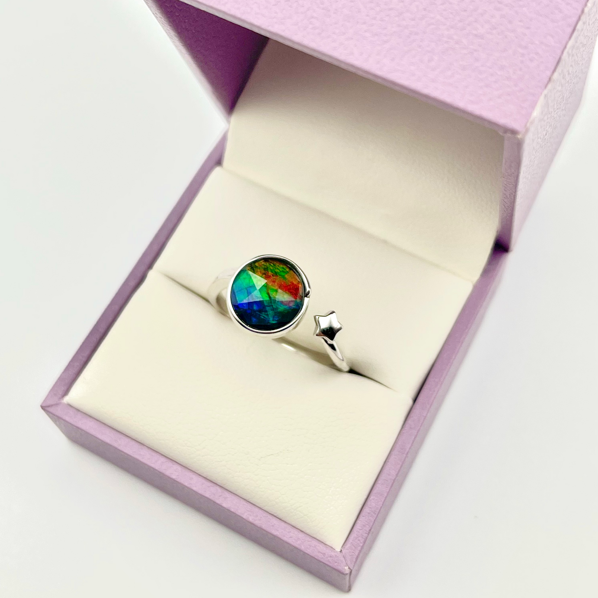 This adjustable sterling silver star ring features a stunning 9x9mm faceted Canadian Ammolite gemstone radiating vivid hues of blue, green, and red. Ethically sourced from Alberta, Canada, this natural gem shimmers with color from every angle—each piece as unique as a northern sky.